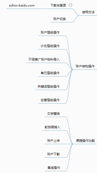 百度推广客户端为SEMer带来了高效与便捷,熟练使用百度客户端可以节省大量的时间与人力成本。其中,多种便捷的功能使原本繁琐的操作变的简易化,如文字题替换功能可以批量操作推广账户、离线操作功能可以自由备份账户和物料等等。百度推广客户端适用于任何类型的百度推广账户,尤其适用于账户结构复杂、关键词较多的情况。那么客户端里能进行哪些操作这个在客户端里一看便知,我们就不做过多的赘述了。百度推广客户端使用的原理也非常简单。简单来说,只需要下载账户、离线编辑、上传账户三步即可。我给大家整理出来一个大体的脑图步骤: